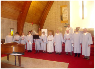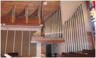 (We have musicians at all skill levels and some are trained teachers who can find a way to use and enhance your skills in music. Left) The church organ now has 4 manuals and 40 ranks of pipes placed in positions in front of the new, huge stained glass window in the front of Trinity. The new church is 128 feet long, 48 feet wide , and rises 50 feet in the air at the peak of the roof. This has allowed the beautiful sound of music played to resound in the interior of the church.