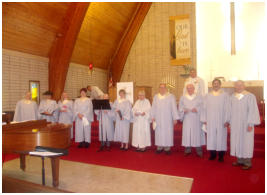 (We have musicians at all skill levels and some are trained teachers who can find a way to use and enhance your skills in music. Left) The church organ now has 4 manuals and 40 ranks of pipes placed in positions in front of the new, huge stained glass window in the front of Trinity. The new church is 128 feet long, 48 feet wide , and rises 50 feet in the air at the peak of the roof. This has allowed the beautiful sound of music played to resound in the interior of the church.